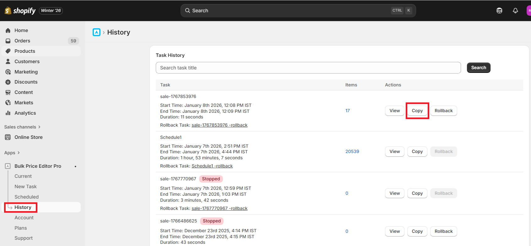 1) Go to the "History" section in the app dashboard. Here you will find the list of the sale tasks and rollback tasks performed.